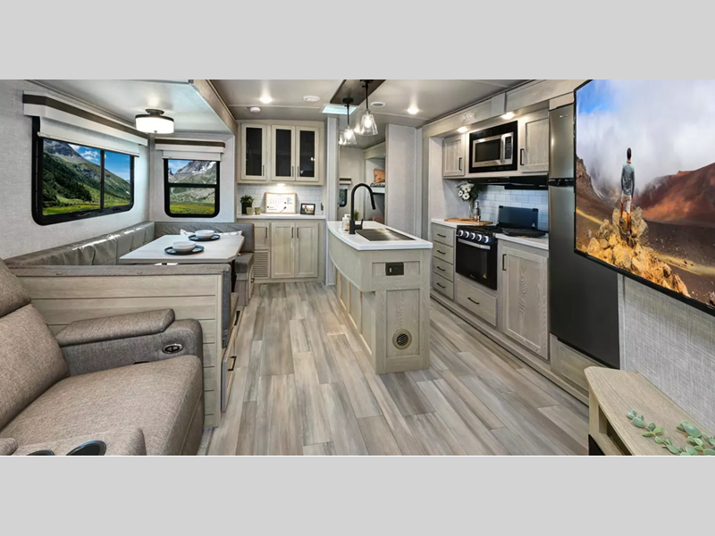 Outside, you'll find a power awning with an adjustable rain dump and LED lighting, backup camera pre, Keyed Alike locks, plus many more conveniences. The enclosed underbelly will help extend your camping season, and you can enjoy your RV for years thanks to the durable construction materials, like the radiant foil insulation and 5/8" plywood tongue and groove subfloor. Each fifth wheel and travel trailer also includes lino flooring in all slides, aluminum dinette, bed and bunk, plus solid surface kitchen countertops.