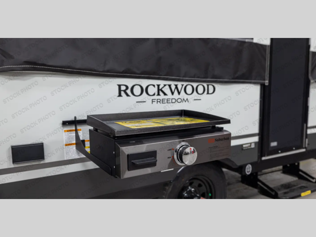 This Rockwood Freedom Series folding pop-up camper is going to let you camp in freedom! You will be able to use the outdoor griddle to cook up some delicious food, and the 9' awning with an LED light will keep you protected while you work. You will also find that the booth dinette will be useful for both meal time and bed time when the two tent end beds aren't enough space, and the storage lid under the front bed provides storage for luggage, blankets, and more!