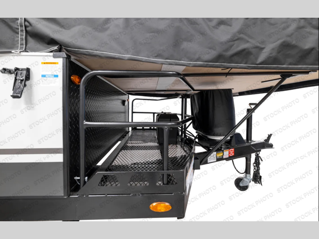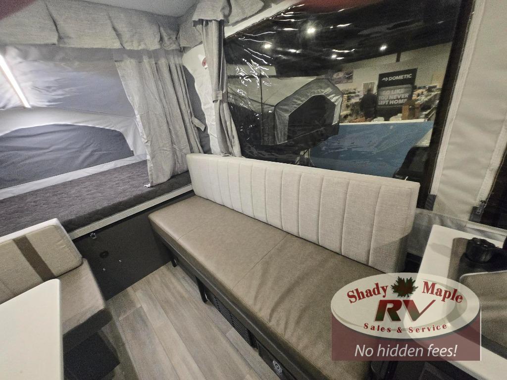 This Rockwood Freedom Series folding pop-up camper is going to let you camp in freedom! You will be able to use the outdoor griddle to cook up some delicious food, and the 11' awning with an LED light will keep you protected while you work. You will also find that the booth dinette will be useful for both meal time and bed time when the two tent end beds aren't enough space, along with the gaucho bed. This camper also includes a front deck storage with expanded metal decking for all your camping gear!