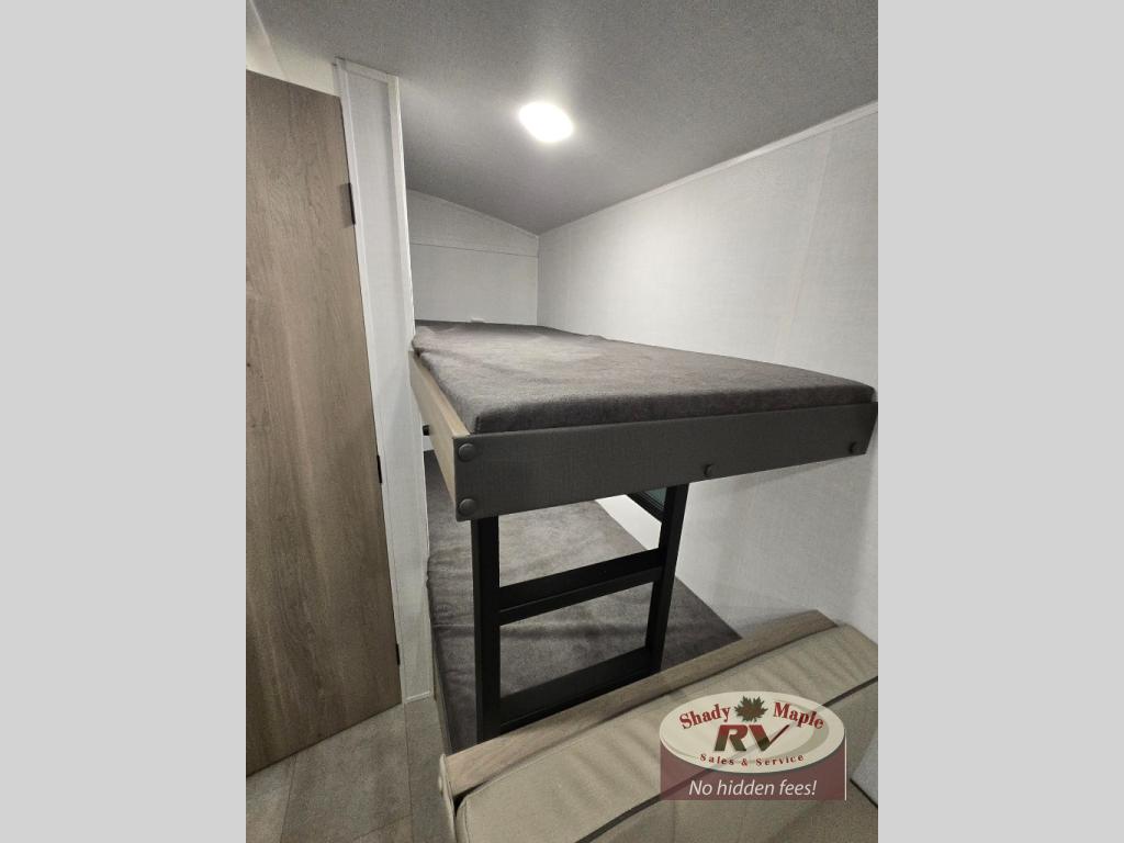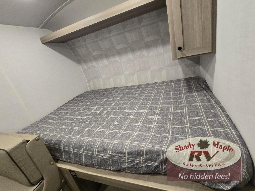 When you enter this compact but mighty trailer, you’re greeted by a comfortable 54" x 80" full bed at the front, complete with a shelf and wardrobe to keep your clothing and essentials neatly organized. To one side sits a cozy 32" dinette, perfect for enjoying a meal or playing a board game after a day of exploring. Across from it, the well-equipped kitchen includes a sink, microwave, and refrigerator everything you need to quickly whip up a meal. One rear corner houses a convenient bathroom with a shower and toilet, giving you the comfort of home without relying on campsite facilities. In the opposite corner, 30" x 74" double bunks provide extra sleeping space so more guests can join the adventure.