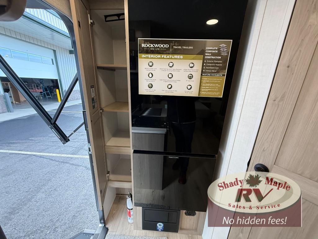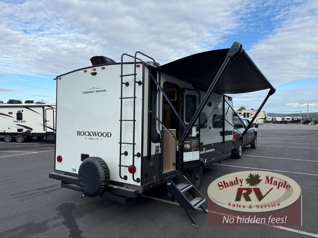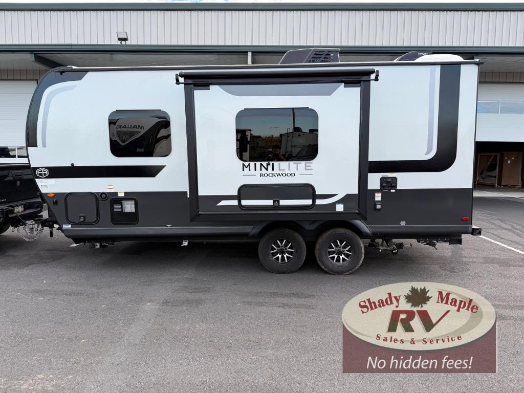 Each Rockwood Mini Lite travel trailer by Forest River is constructed with a fully laminated one-piece walkable roof, sleek frameless windows, and a six-sided full aluminum frame for strength and durability. The 12V thermostatically controlled heated tanks, plus radiant foil in the underbelly will allow you to camp well into the colder months, and the 200W roof solar panel will be perfect for a little off-gridding. Each model includes solid surface kitchen countertops, hidden hinge cabinet doors, roller shades, plus many more interior features. Having an AIR 360+ omnidirectional antenna with WiFi prep on board gives you the option to get some work done if it's needed, and the power tongue jack provides hassle-free set up, so you can enjoy more time relaxing!