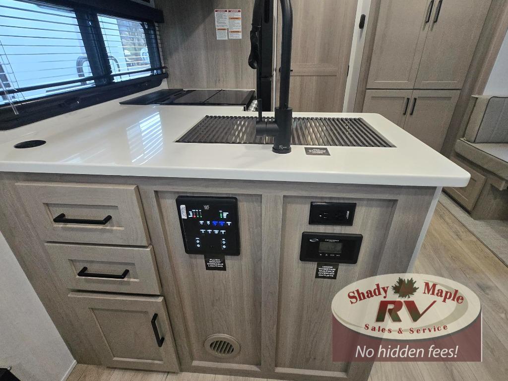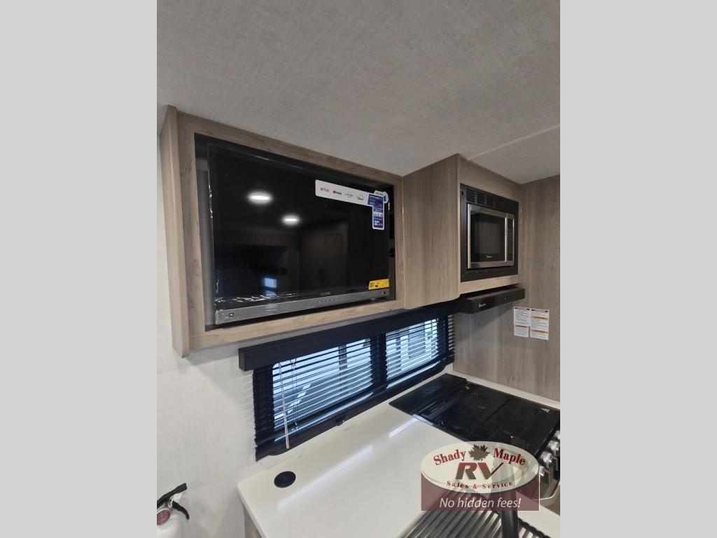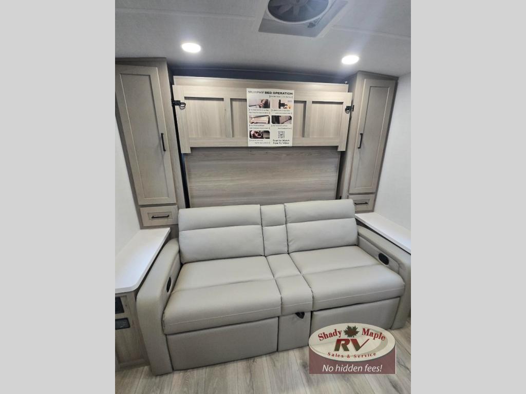 This versatile and cozy travel trailer will be perfect for weekend trips to the lake. Once you arrive at your campground, you can unload the water toys from the pass-thru storage, put out the 15' power awning, then make lunch on the exterior griddle. The U-shaped dinette slide inside will provide a place to dine, play board games, and let a guest or two sleep over, while you take the RV queen-size Murphy bed up front. In the morning, just fold up the bed to expose the 74" sofa! There is a three burner cooktop and microwave oven in the kitchen to make meals each day, along with a 12V refrigerator to keep leftovers fresh.