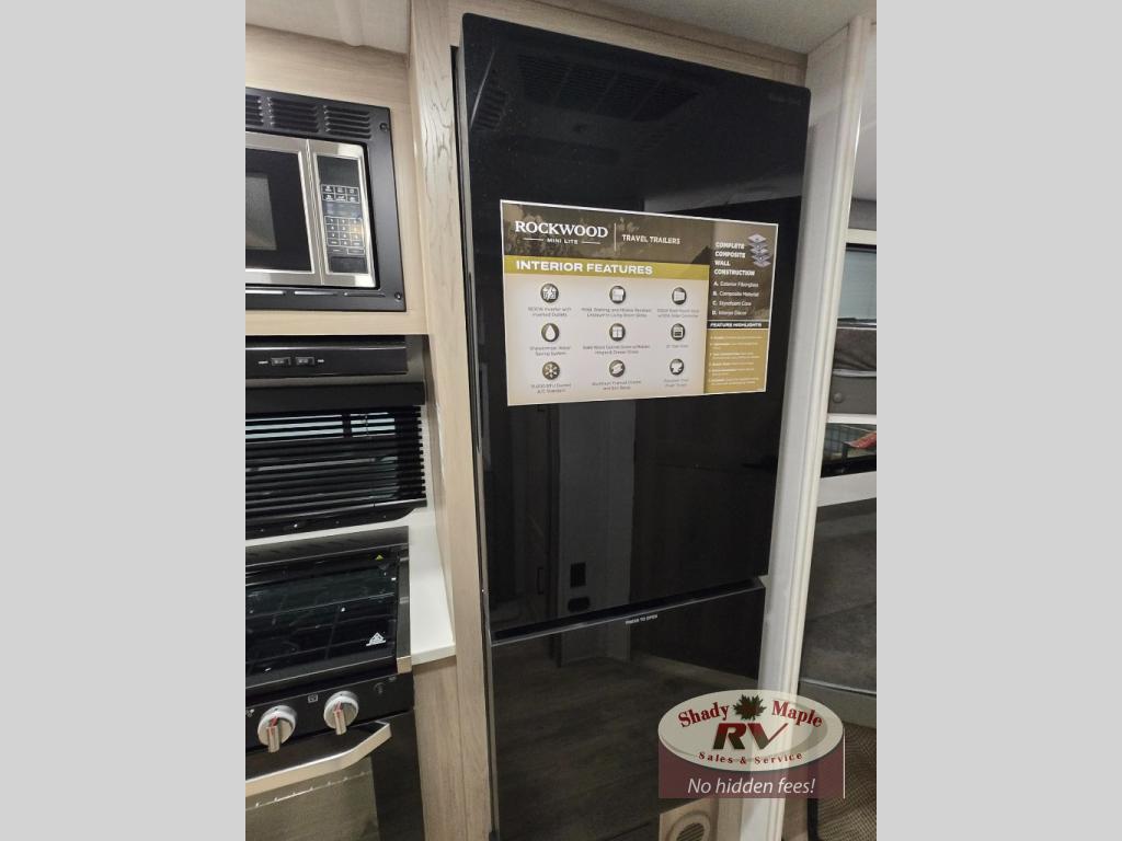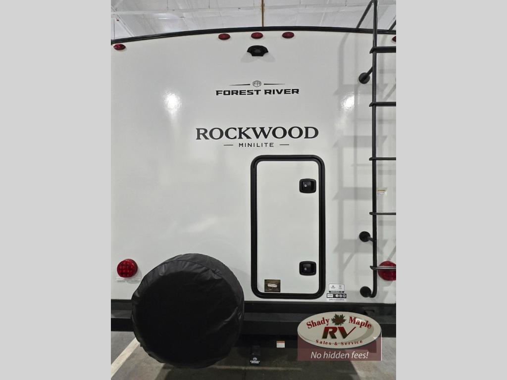 Each Rockwood Mini Lite travel trailer by Forest River is constructed with a fully laminated one-piece walkable roof, sleek frameless windows, and a six-sided full aluminum frame for strength and durability. The 12V thermostatically controlled heated tanks, plus radiant foil in the underbelly will allow you to camp well into the colder months, and the 200W roof solar panel will be perfect for a little off-gridding. Each model includes solid surface kitchen countertops, hidden hinge cabinet doors, roller shades, plus many more interior features. Having an AIR 360+ omnidirectional antenna with WiFi prep on board gives you the option to get some work done if it's needed, and the power tongue jack provides hassle-free set up, so you can enjoy more time relaxing!