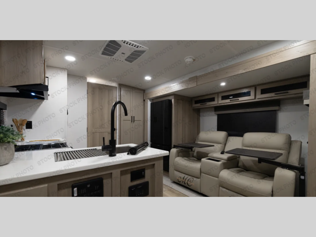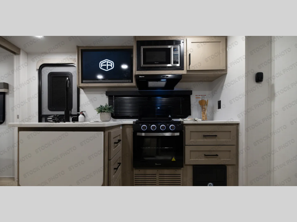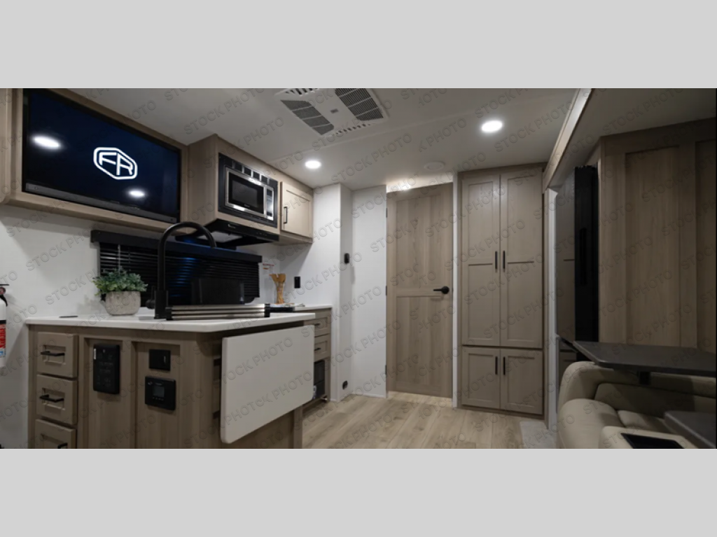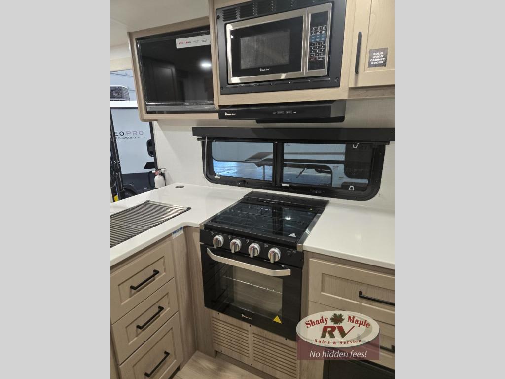 This is the perfect travel trailer for two people looking for comfortable camping trips! You will have your own RV queen bed to sleep on in the front private bedroom, and an optional TV can be added if you enjoy the morning news in bed. Breakfast can be made on the three-burner cooktop, or head outdoors to cook on the outside kitchen. The theater seating with tables will provide a place to relax and dine together, and the spacious full rear bath will allow you to clean up before you head out for the day. This model includes plenty of storage space, including two pantries, a wardrobe slide out in the bedroom, plus a drop-frame pass-through storage for larger camp gear!