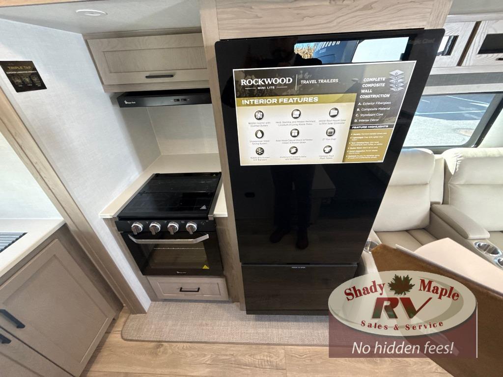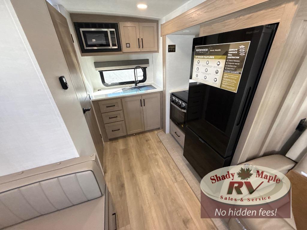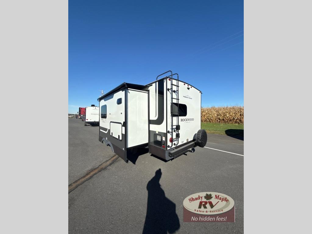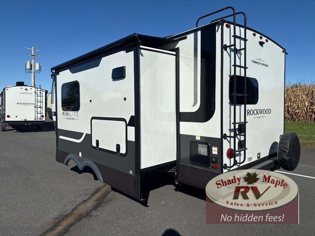 Each Rockwood Mini Lite travel trailer by Forest River is constructed with a fully laminated one-piece walkable roof, sleek frameless windows, and a six-sided full aluminum frame for strength and durability. The 12V thermostatically controlled heated tanks, plus radiant foil in the underbelly will allow you to camp well into the colder months, and the 200W roof solar panel will be perfect for a little off-gridding. Each model includes solid surface kitchen countertops, hidden hinge cabinet doors, roller shades, plus many more interior features. Having an AIR 360+ omnidirectional antenna with WiFi prep on board gives you the option to get some work done if it's needed, and the power tongue jack provides hassle-free set up, so you can enjoy more time relaxing!