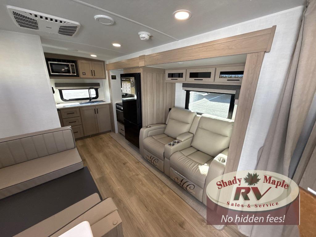 This stunning travel trailer is designed to provide the ultimate in comfort, convenience on the open road. The full bathroom is a haven for relaxation and refreshment, while the kitchen is equipped with a microwave, overhead cabinets, a three-burner cooktop, and a 12V refrigerator, making meal prep and dining the easiest task. The kitchen pantry provides ample storage for your favorite ingredients. Further, the booth dinette is a cozy spot for meals or socializing, and the theater seating is perfect for relaxing and enjoying your favorite shows or movies on the 12V Smart TV. Plus, the front bedroom is a serene retreat, featuring a spacious queen bed and convenient wardrobe, providing the perfect spot to rest and recharge after a day of adventure.
