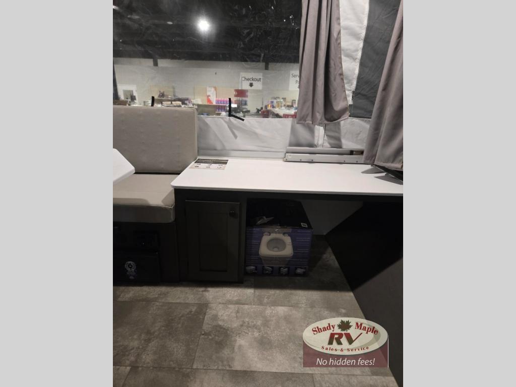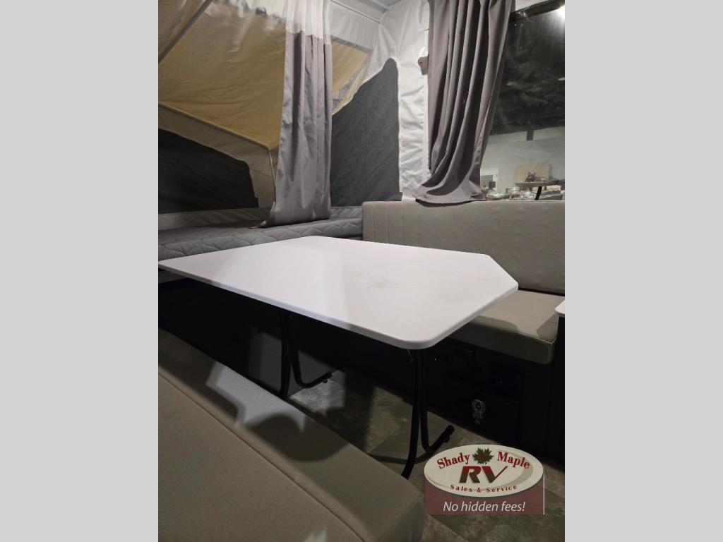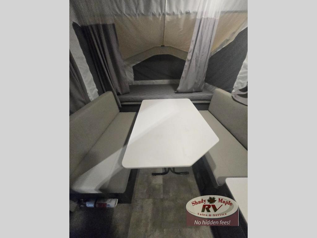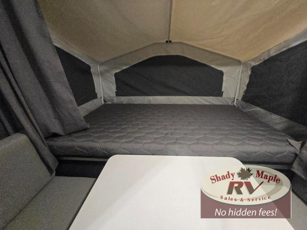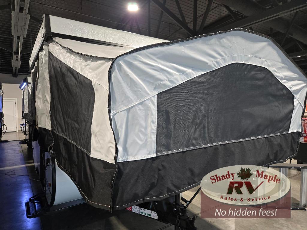 With any Rockwood OTG (Off The Ground) folding pop-up camper by Forest River, you will enjoy a more simple approach to outdoor fun. If you're a regular tent camper, but are looking for a little more comfort, then take a look at these easy-to-tow models! There are electric brakes, 12" radial tires, and Dexter sprung axles that provide that easy towing, and the clay fiberglass exterior is durable. A one-piece screen door also comes standard so you can let fresh air in, while keeping bugs out, and the LED interior lights will be an added benefit you didn't have while tent camping. Each model also includes residential style cabinet doors, wood look flooring, and an Andover Sable wood interior for a more outdoorsy feel!