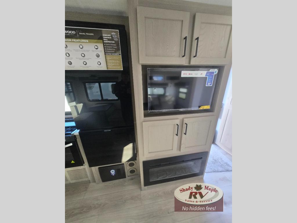 This trailer is the perfect couple's retreat with its private bedroom up front which includes a queen bed, a slide out wardrobe, and a TV option. The spacious rear full bathroom provides a shower and linen storage, and a space savings sliding door. The cook will have full amenities with ample counter space, a walk-in pantry for food storage, and a three burner range to cook meals on. If the weather is nice outside, you can turn on the outside speakers to enjoy music, and there is a 21' awning to relax under. Or you can stay inside to enjoy the fireplace and Smart TV! You will also appreciate the pass thru storage with an optional steel sliding tray to easily access gear!