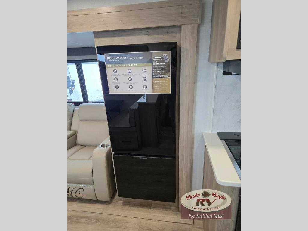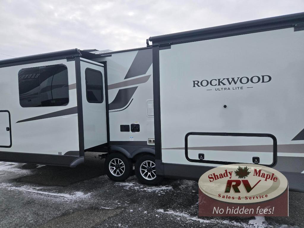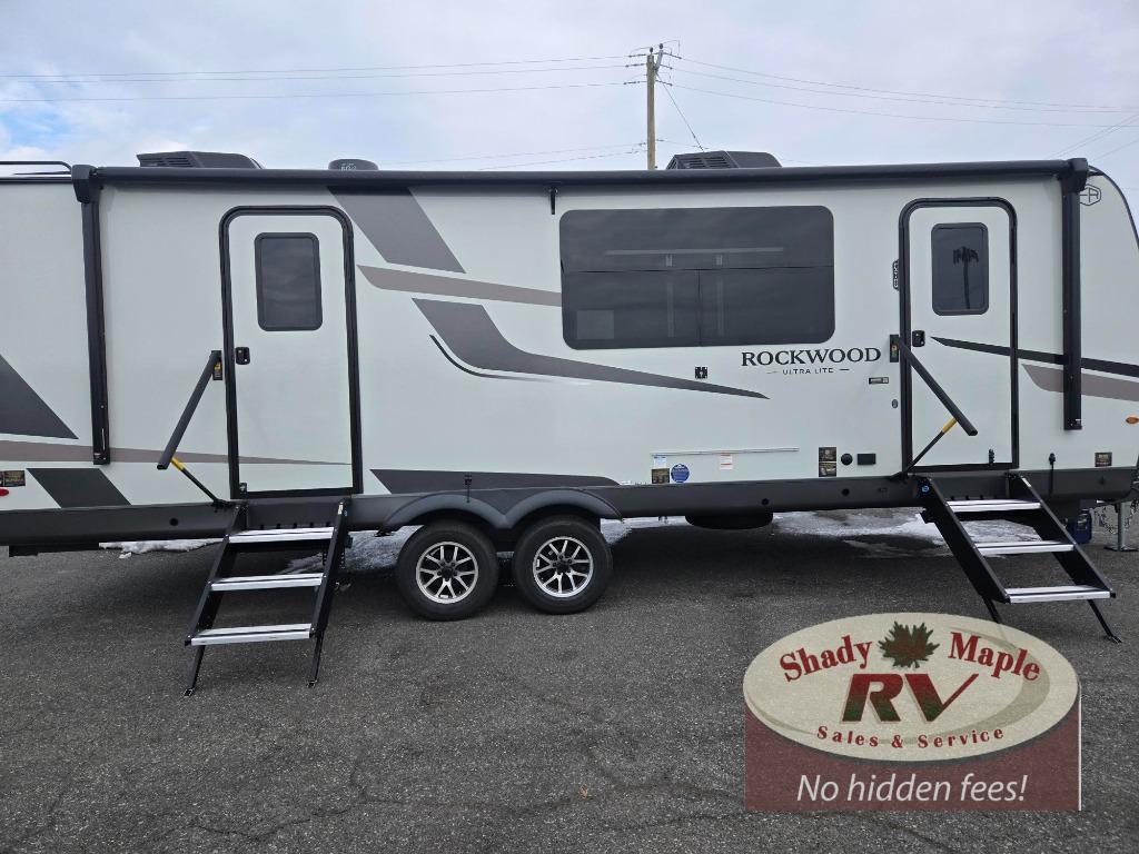 Each Rockwood Ultra Lite travel trailer by Forest River includes superior construction with a high gloss fiberglass cap, aluminum cage construction, and a power awning with LED lighting for a cozy and functional outdoor space. The torsion axle, power tongue jack will make towing smooth and hassle-free, along with the nitrogen filled, Goodyear Endurance tires and the tire pressure monitor system. Interior comforts include kitchen sink with high rise faucet, hidden hinge cabinet doors, and roller shades to name a few. Choose a Rockwood Ultra Lite travel trailer today!