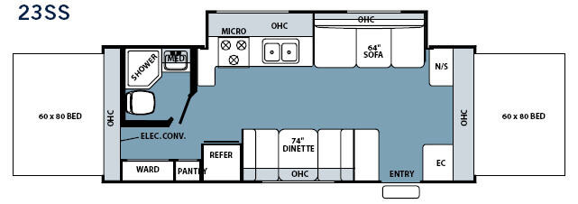 Single Slide, Front & Rear Queen Tent End Beds, Angle Shower, Med. Cabinet, Lav., Wardrobe, Pantry, Refrigerator, 3 Burner Range, Double Kitchen Sink, Sofa, Booth Dinette, Ent. Center, Nightstand, Overhead Cabinets and More.