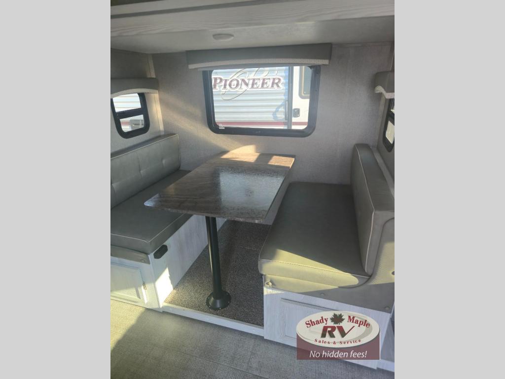 The kids will claim the bunk beds for themselves while you will have your own full-size bed up front next to the entry. The bottom bunk even folds up to be able to store a few items through the bike door to travel inside. You will find that 44" booth dinette slide offers more floor and sleeping space, plus dining. After the cook makes a meal in the kitchen which includes a pantry or on the outside gas griddle, you can play a game or visit while sitting at the dinette. You can also enjoy spending your evenings relaxing outside underneath the 14' power awning or by a campfire while telling each other stories about the day.