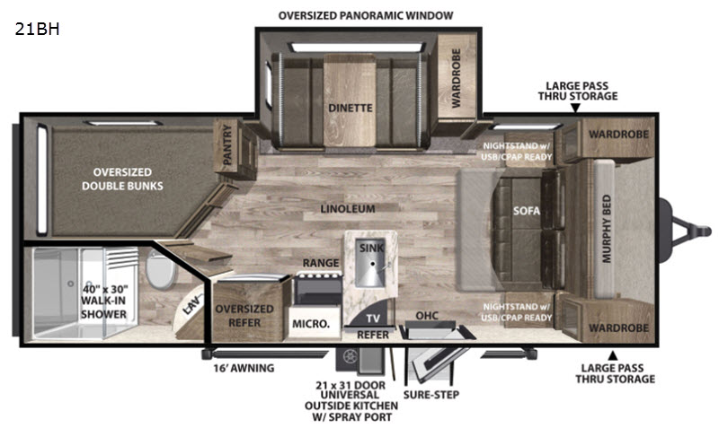 You will have a full kitchen to make warm meals inside including being able to store leftovers in the oversized refrigerator, and plenty of snacks for the kids in the pantry that is near the double size bunks. The full bathroom is near by for quick access at night, and you will surely enjoy getting cleaned up in the walk-in shower. The Murphy bed up front allows you to sit on a sofa during the daytime, and easily set up your bed at night. You will appreciate the nightstands that are USB/CPAP ready, and the triple wardrobes in this trailer. When you like, make a few meals on the outside kitchen with spray port, relax under the 16' awning with LED light, and store a few items in the large pass through storage.