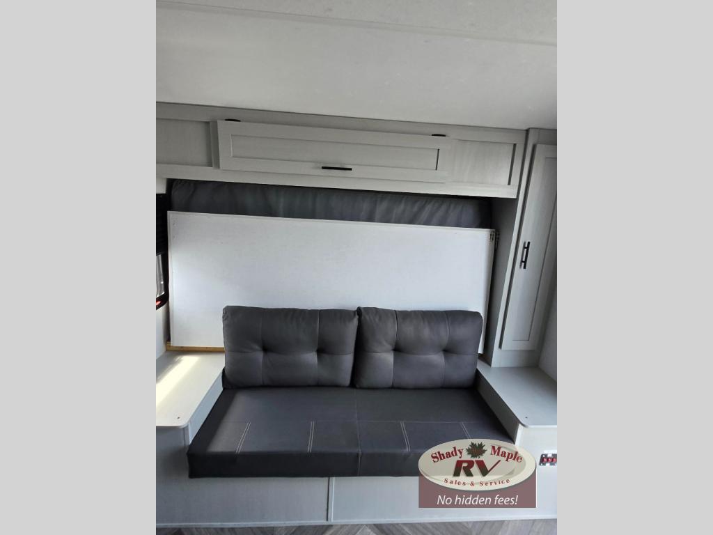 You will feel right at home in this travel trailer! It features a front Murphy bed that offers versatile living with a queen bed to sleep on at night and a sofa to sit on during the day. The kids will enjoy a good night's rest on the double over double bunk beds, and love having the rear corner bathroom right next to them at night. Grab some eggs and bacon from the 6 cu. ft. refrigerator to fry up on the cooktop then enjoy them at the U-shaped dinette while looking out at your beautiful scenery through the panoramic window. You could even choose to experience your scenery first hand while you cook at the outside LP griddle too, plus there is a 14' power awning to protect you and a refrigerator to keep your beverage cold!