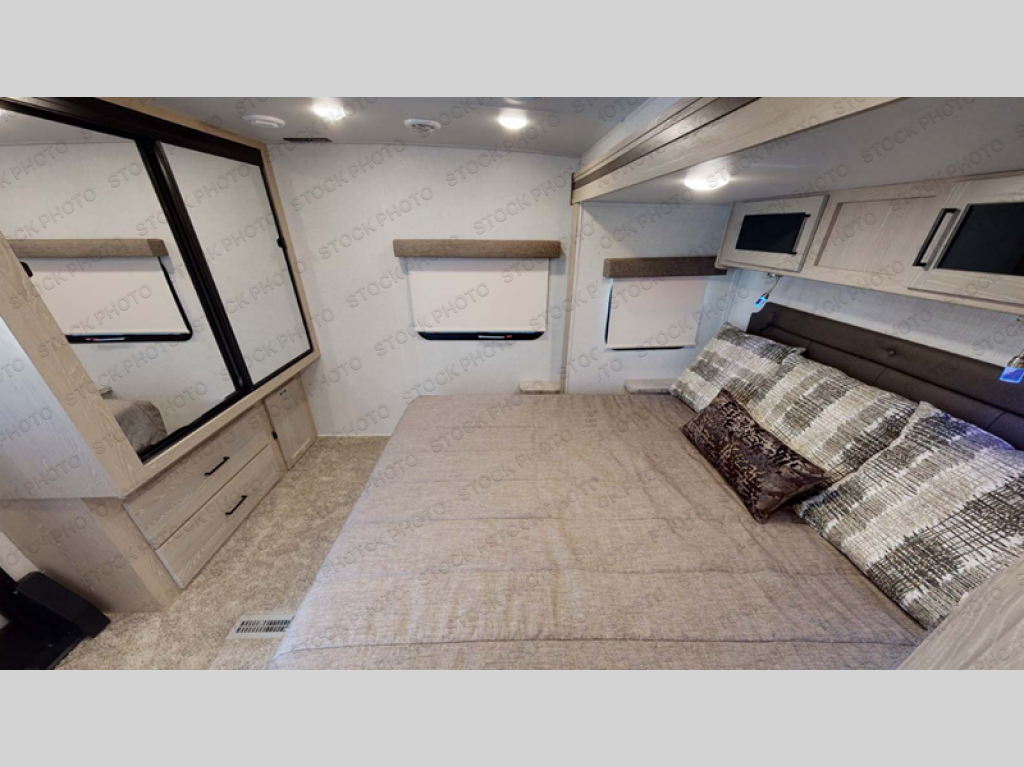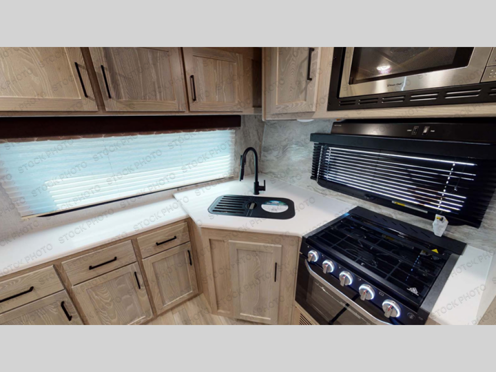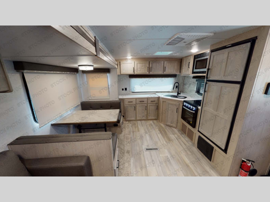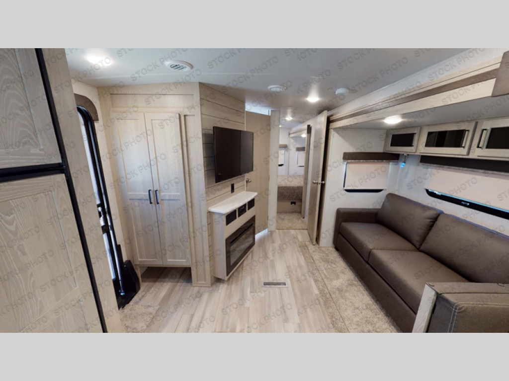 When you are outside this trailer you can enjoy the protection from the 21' power awning, and whip up a meal using the outside griddle. You will find exterior storage for your extra gear, and a ladder on the rear. You get to choose which entrance to step up into, be it the spacious rear bedroom with a queen bed slide and a wardrobe, or the main entry into the kitchen and living area. The furniture slide includes a booth dinette to eat your meals at, and theater seating to watch the LED TV with fireplace below. And the cook will love the front kitchen with extra counter space, and the appliances are nearby to make warm meals, and the pantry is next to the entry allowing you to grab a snack on your way out for a hike.