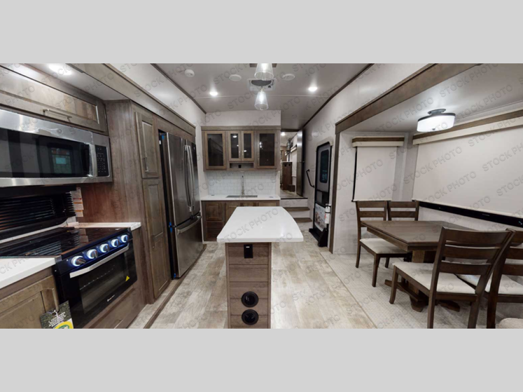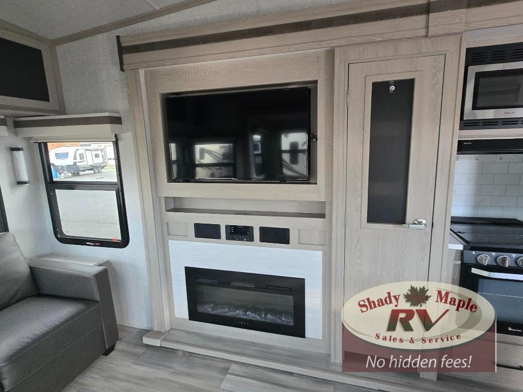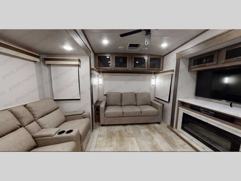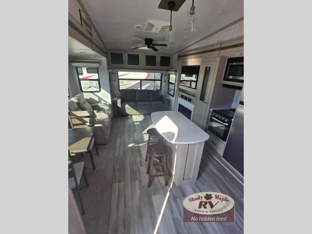 You can enjoy views from inside or outside each day once this RV is setup at the campgrounds! The large windows in the furniture slide and the windows throughout allow you to take in the scenery, and the three slide outs give you a spacious main living and kitchen area as well as front bedroom. You will find lots of seating for guests on the hide-a-bed sofa in the rear, and on the theater seats and booth dinette in the slide, plus there are two stools to use at the kitchen island. The cook will love the residential refrigerator and large pantry to store lots of food, and everyone can enjoy the LED TV and fireplace when visiting and relaxing. And the front bedroom offers a queen bed slide, a front wardrobe, a shirt closet and a space prepped for a washer/dryer option, plus a dresser.