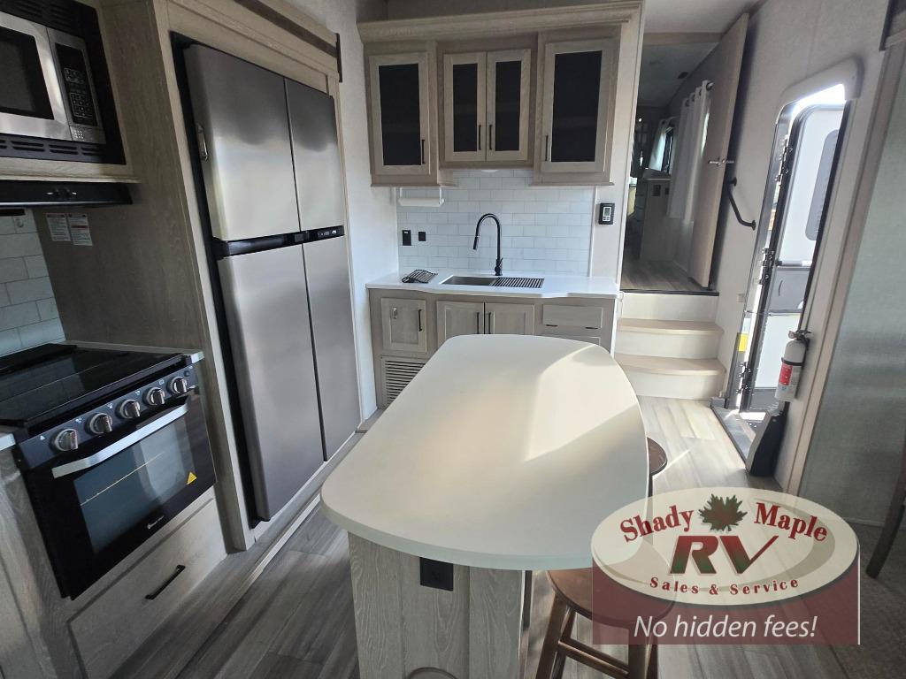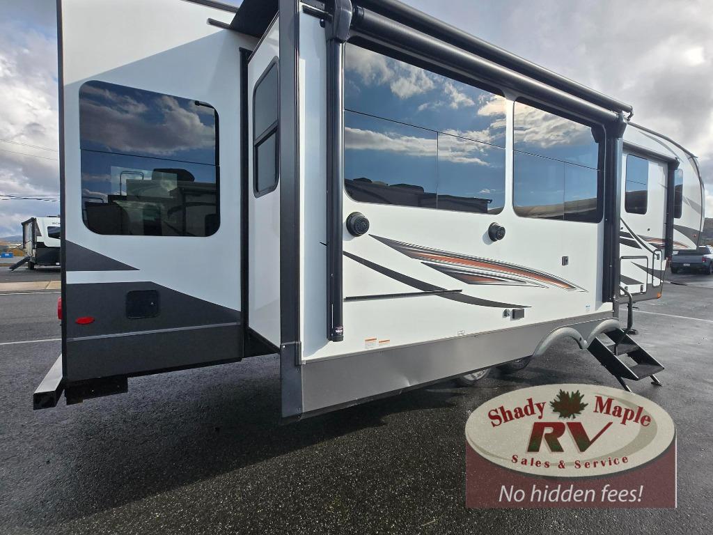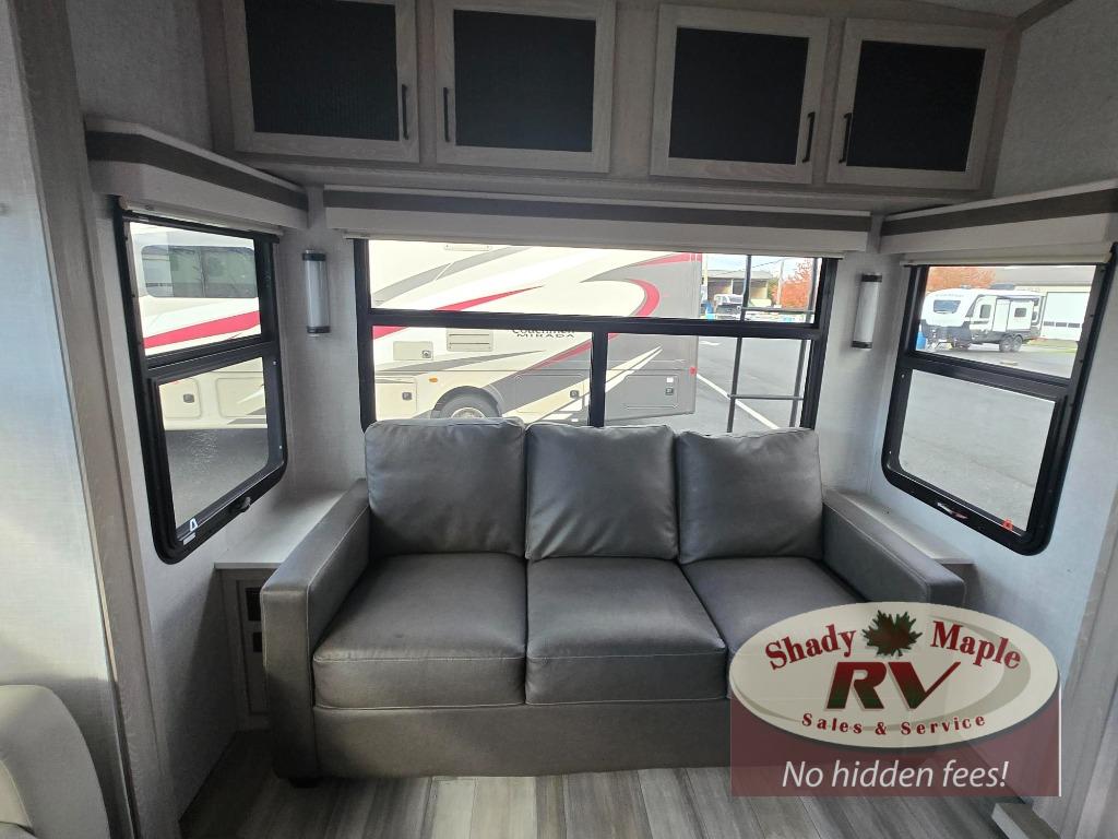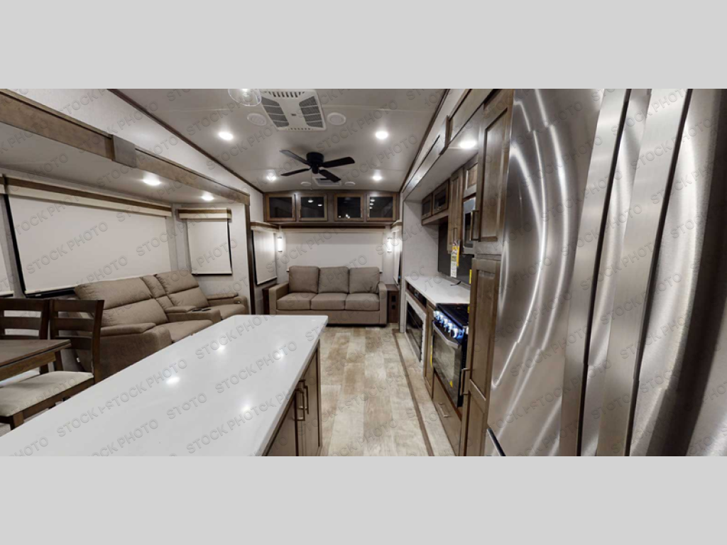 You can enjoy views from inside or outside each day once this RV is setup at the campgrounds! The large windows in the furniture slide and the windows throughout allow you to take in the scenery, and the three slide outs give you a spacious main living and kitchen area as well as front bedroom. You will find lots of seating for guests on the hide-a-bed sofa in the rear, and on the theater seats and booth dinette in the slide, plus there are two stools to use at the kitchen island. The cook will love the residential refrigerator and large pantry to store lots of food, and everyone can enjoy the LED TV and fireplace when visiting and relaxing. And the front bedroom offers a queen bed slide, a front wardrobe, a shirt closet and a space prepped for a washer/dryer option, plus a dresser.