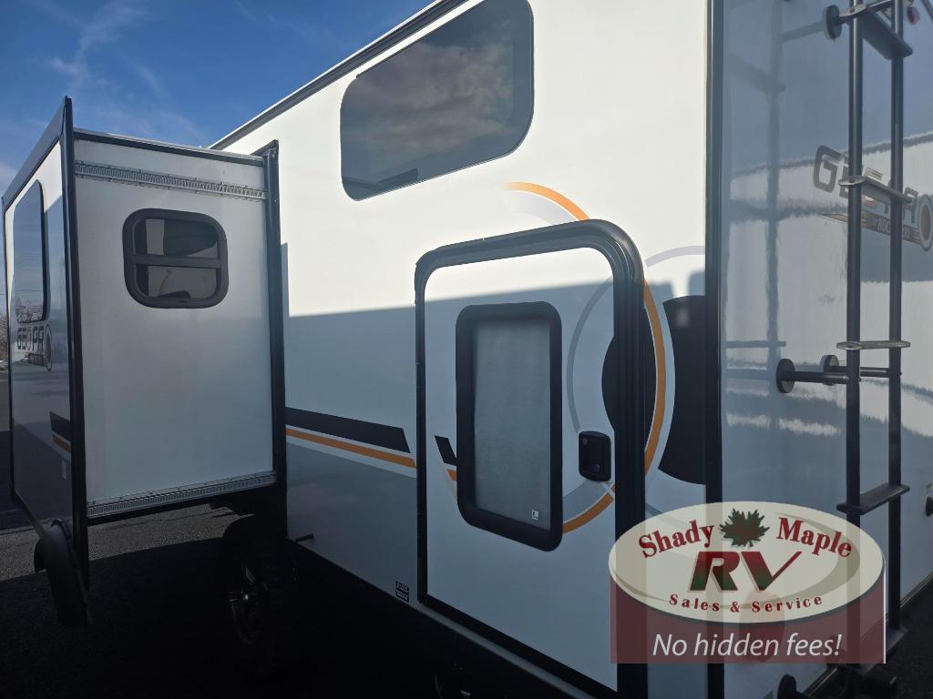 Your going to love camping with your family or friends in this largest bunk model in the GEO Pro lineup. The bunk beds will be perfect for little ones, while you take the front full-size bed. There is also a 44" booth dinette within the slide out for additional sleeping and seating space. The kitchen includes everything the chef will need to prepare meals each day, including a three burner cooktop, a microwave oven, and a 12V refrigerator for perishables. If the weather is nice, you may just find the chef outdoors cooking on the outside griddle under the 14' power awning. And check out the exterior bike door that will be perfect for bikes, luggage, or extra camp gear!