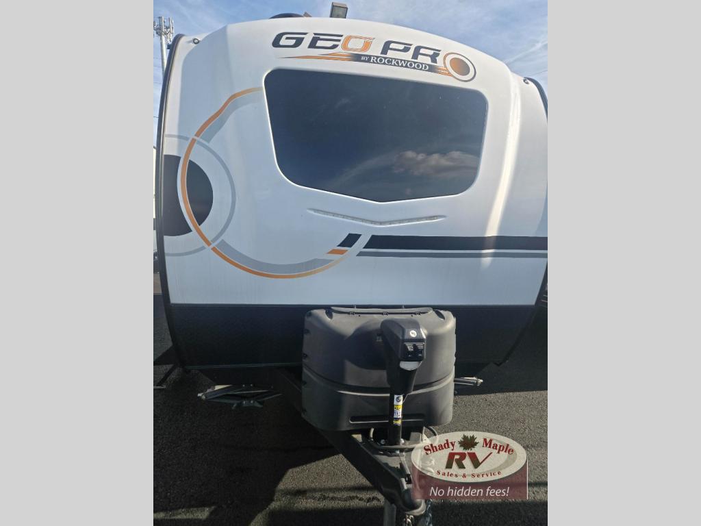 The Rockwood GEO Pro travel trailers and toy hauler by Forest River are ready for all your adventures. The interior and exterior Azdel construction, along with the vacuum laminated roof and walls provide a durable trailer, and the Dexter torsion axles with aluminum wheels make towing easier than ever. There are many convenient amenities, like the 13,500 BTU A/C, the Bluetooth system control panel, and the all-in-one Teton HD TV/WiFi/FM antenna with LTE prep. Each model includes frameless windows, fabric valances and roller shades, and a modern interior that will make you feel right at home. Everything you're looking for in your next RV is in a Rockwood GEO pro by Forest River!
