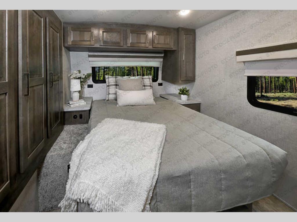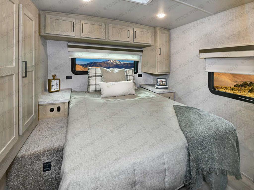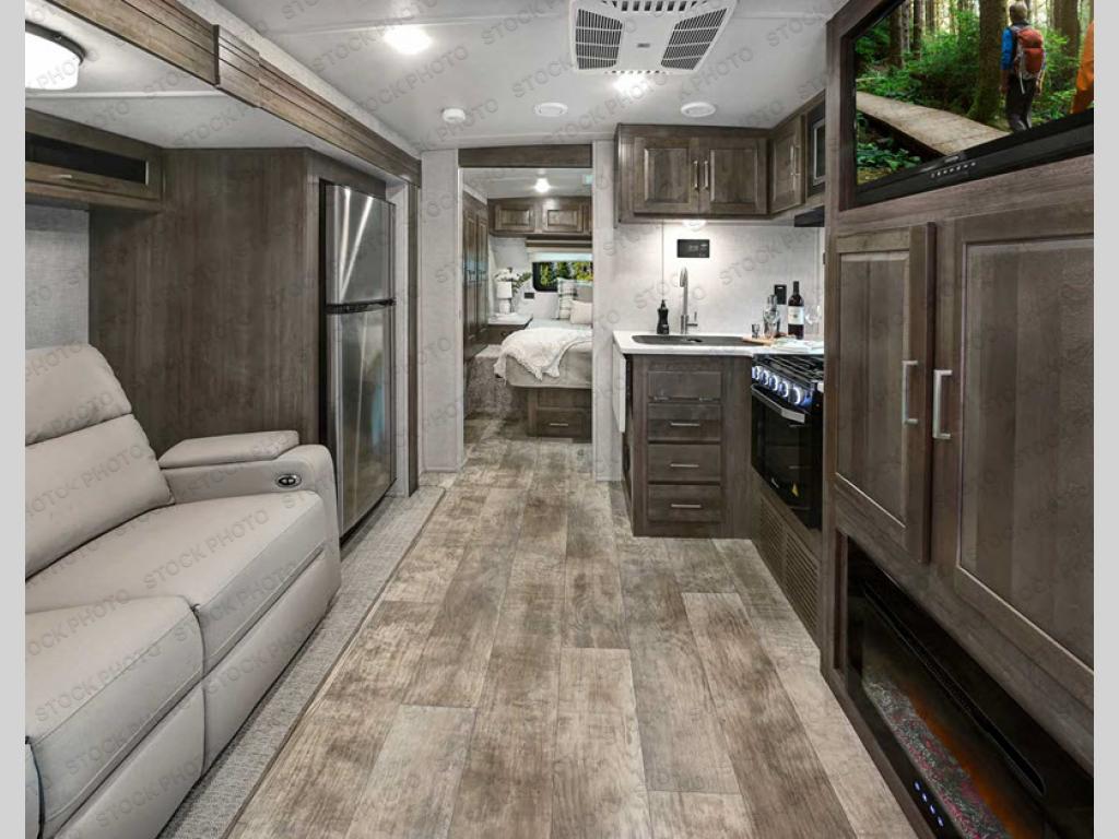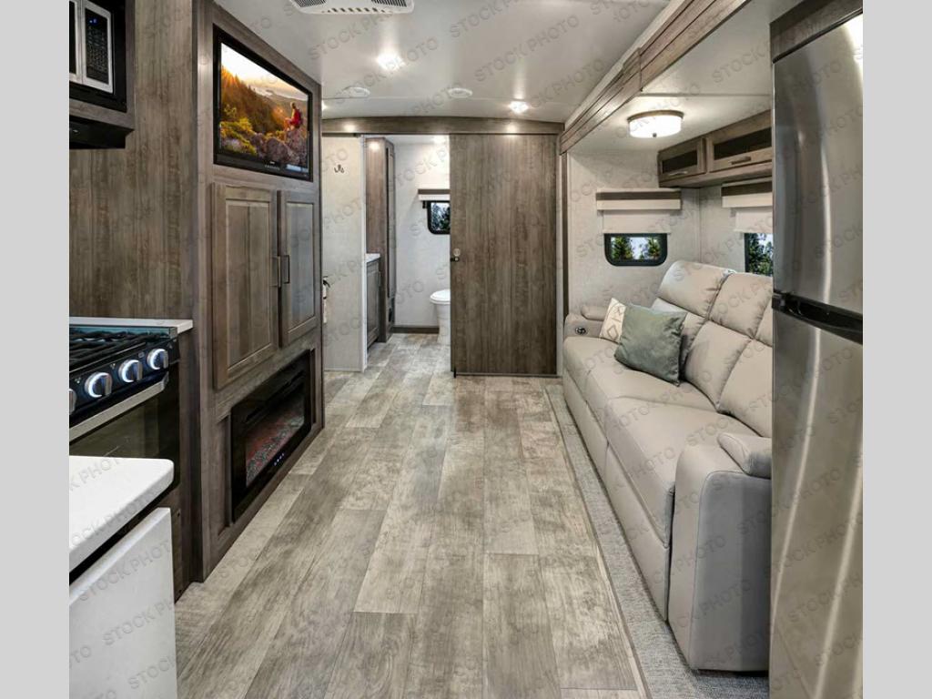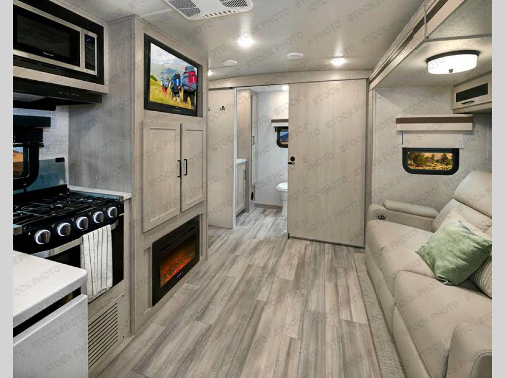 Camping trips to the lake just got sweeter with this dual slide out travel trailer in tow! Once you arrive, unload your gear from the exterior drop-frame pass-through storage, then start lunch on the exterior griddle. If you need a rest after traveling all day, the RV queen bed in the front bedroom is sure to give you comfort, or you can relax on the theater seating. The fireplace and entertainment center with an LED TV will make this space feel just like home, and check out the spacious full rear bath for added privacy. This model also includes an entryway closet/pantry for jackets, shoes, and food!