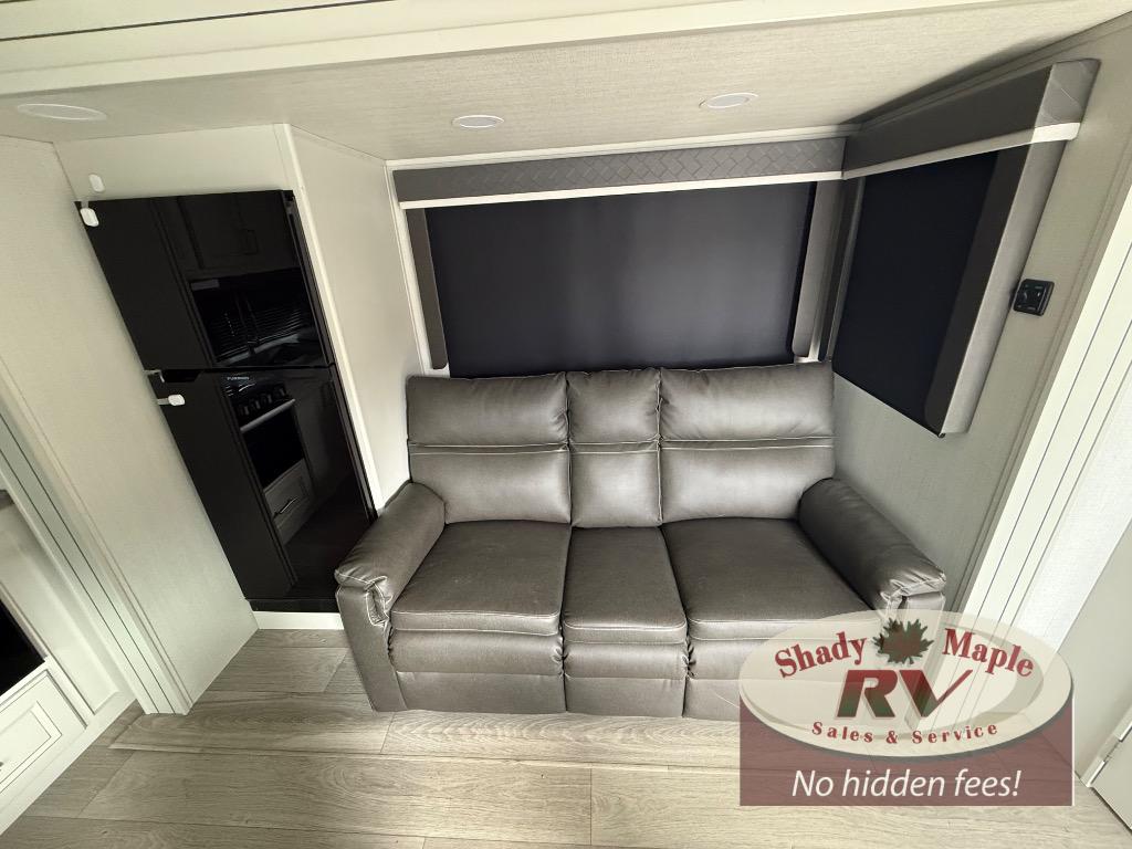If you are looking for a fifth wheel that sleeps four to six with inside and outside cooking then check this unit out! This unit offers a short, mid-living layout with a bedroom wardrobe slide and combined 12 volt refrigerator and 68" tri-fold sofa sleeper slide for added floorspace to move about. Up front, you will enjoy a private bedroom with a queen bed and bedside wardrobe/nightstands as well as a larger wardrobe that slides out along the curbside wall. A complete bath provides a large shower, toilet and sink, plus linen storage which you are sure to appreciate as you travel. There are plenty of options for this unit making it easy to customize to your use and style. The theater seating and free standing dinette options can be selected in place of the sleeper sofa and booth dinette if you prefer. If you enjoy spending time outdoors, imagine making breakfast for your friends and family using the outside griddle. There is also a 16' awning to create even more living space to enjoy, and the unobstructed pass-through storage compartment can easily house all of your outdoor camping gear like lawn chairs and yard games.